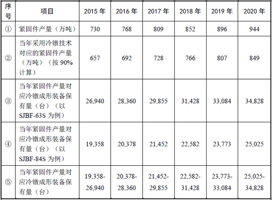 冷鐓成形裝備年度市場需求與當(dāng)年緊固件生產(chǎn)情況密切相關(guān),可以依據(jù)我國緊固件的產(chǎn)量對用于生產(chǎn)緊固件的冷鐓成形裝備市場容量作出估算,下表簡單測算